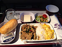 The photo shows an in-flight meal of Thai Airways International flight TG683 Haneda, Tokyo to Bangkok, Thailand (HND - BKK). It was about a seven-hour flight. In-flight meal was served as lunch and refreshment. The first meal was savory Thai Green Curry (Thai: แกงเขียวหวาน) and chicken salad with some rice and bread, plus dessert. Everything was so yummy as usual. Thai Airways was cerebrating its 55th anniversary, it was described on a paper napkin. Refreshment was served about an hour before landing. It was a cup of ice cream and I chose green tea flavor, like Matcha flavor. Two passengers next to me didn't tell any, and they were served vanilla flavor.